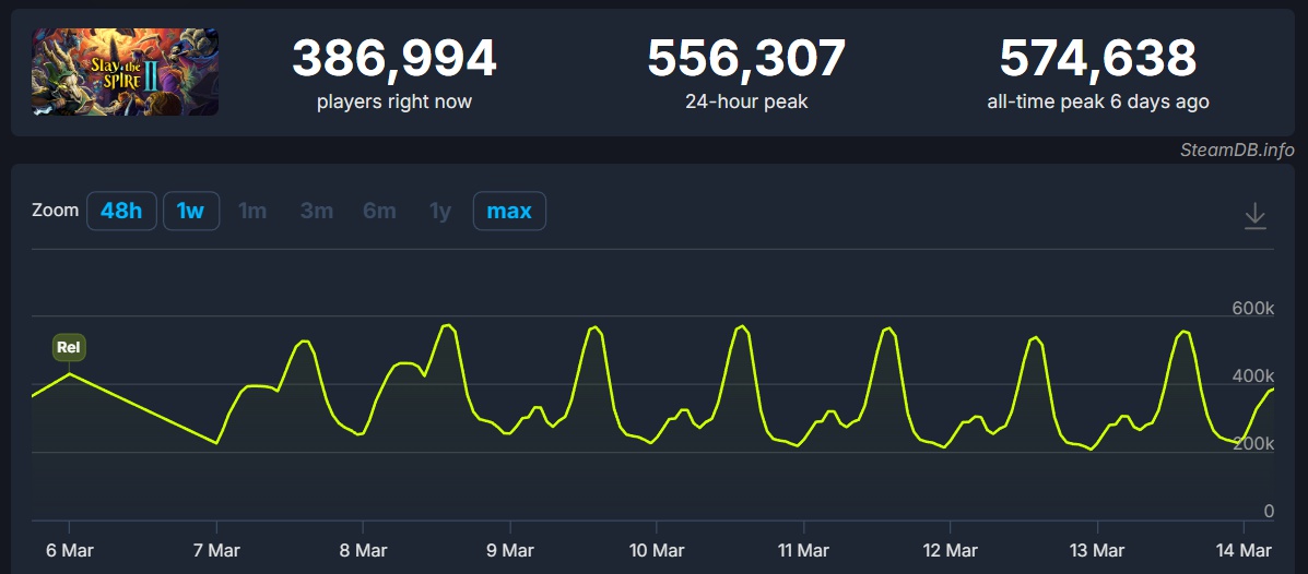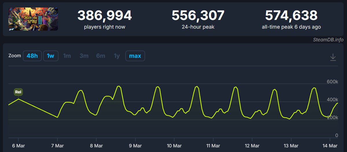 Сейчас Slay the Spire 2 доступна только на ПК — игра продается в Steam. Судя по показателям платформы, Slay the Spire 2 отлично удерживает аудиторию: пиковый онлайн с самого релиза держится выше 500 тысяч человек.