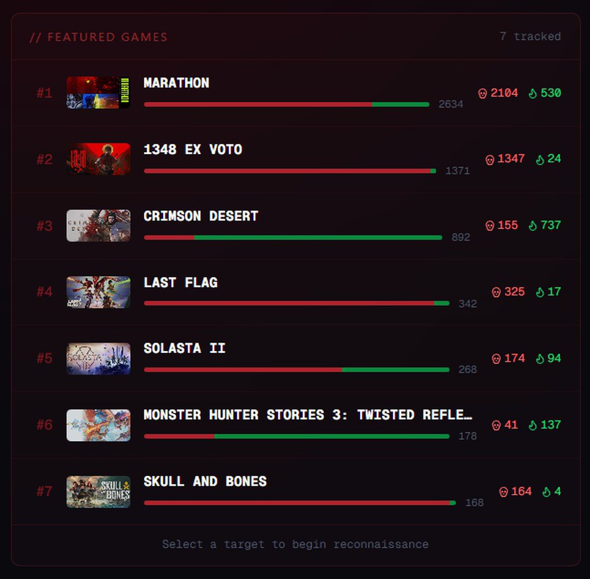 Например, игроки могут оценить шансы на выживание Marathon (большинство верит в провал), Skull and Bones (та же история), Solasta 2 (та же история) и Last Flag (вы угадали).