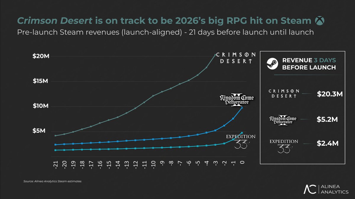 По выручке до релиза на ПК, отмечают аналитики, Crimson Desert превосходит Kingdom Come: Deliverance 2 и Clair Obscur Expedition 33. Предполагается, что после выпуска игра тоже будет продаваться лучше этих проектов.
