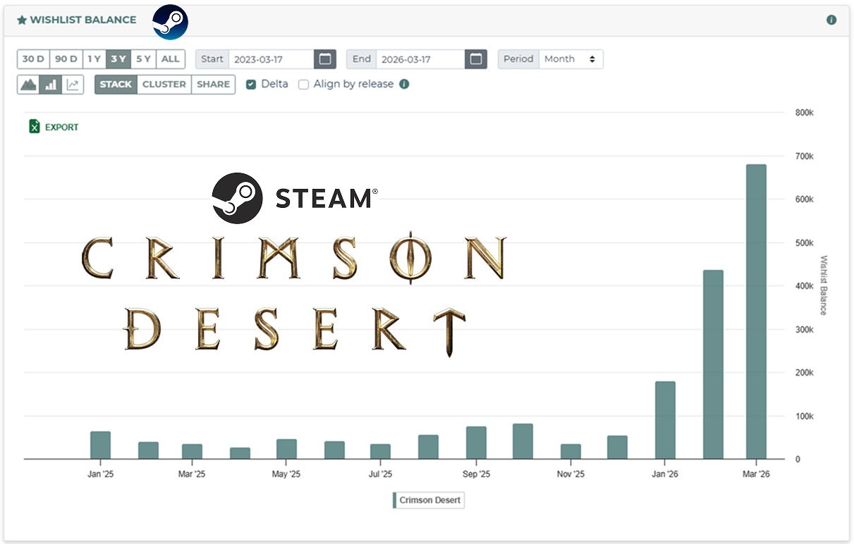 Кроме того, Crimson Desert активно добавляют в список желаемого. С начала февраля и до сегодняшнего момента игра была добавлена в список желаемого свыше 1 миллиона раз, с начала марта — 680 тысяч раз.