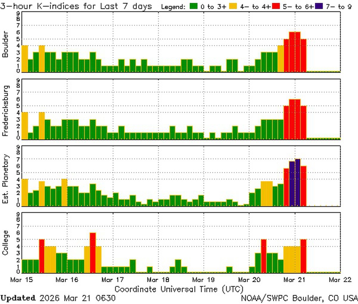 В последних прогнозах предполагалось, что геомагнитная буря 20-21 марта достигнет максимум класса G2. Однако уже в первые часы 21 марта сила магнитной бури достигла класса G3.