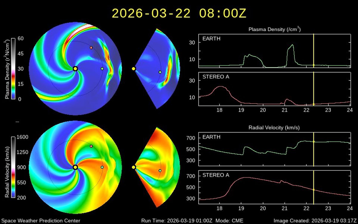 Судя по модели расположения солнечного ветра WSA-Enlil, Земля выйдет из потока частиц не ранее 26 марта. Все эти дни возможны локальные магнитные бури класса G1.