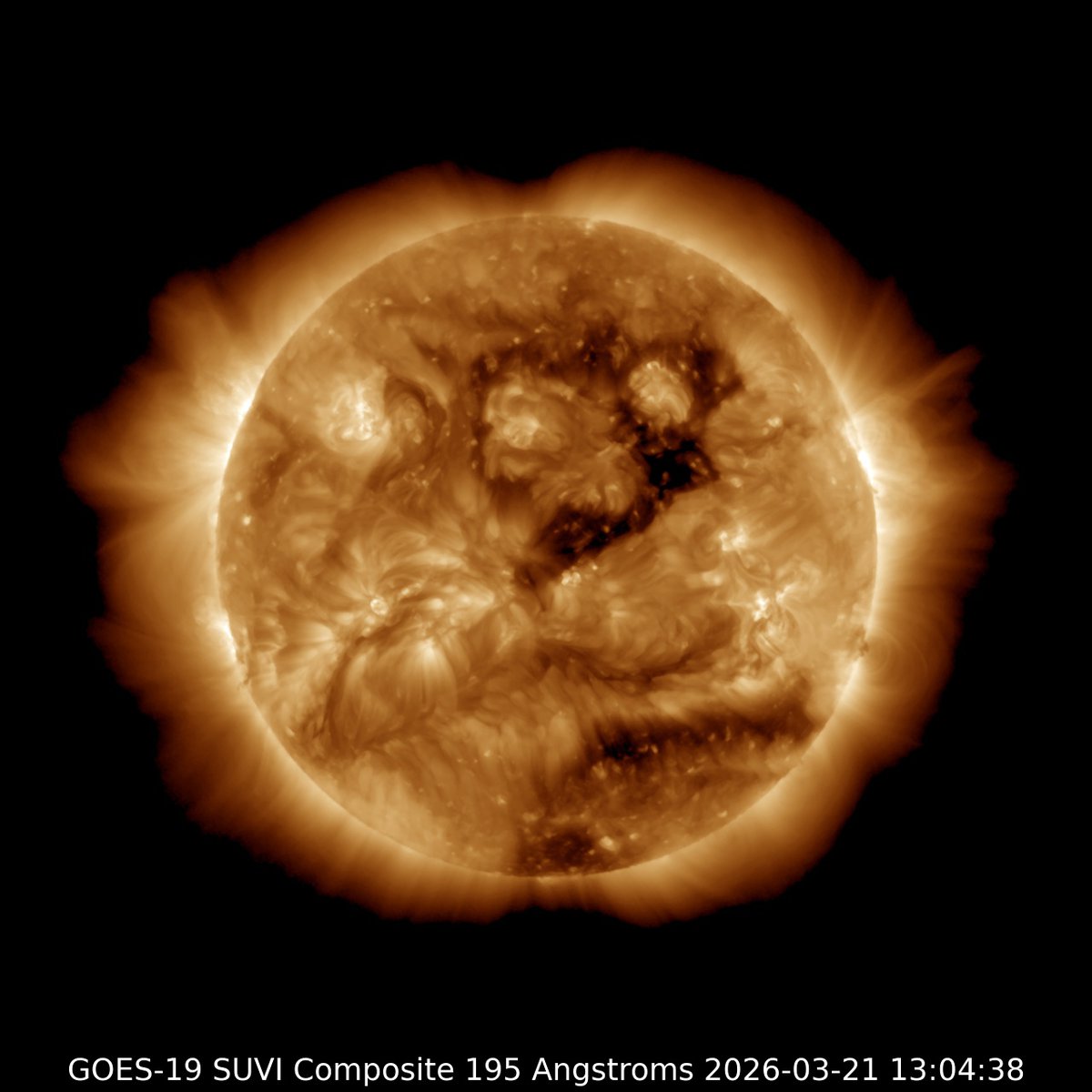 Нынешняя геомагнитная активность — следствие не корональных выбросов массы, инициировавших бурю 20 марта. Теперь Земля находится в потоке солнечного ветра из корональной дыры на Солнце, такой поток крайне редко может «надуть» бурю выше класса G1.