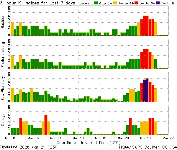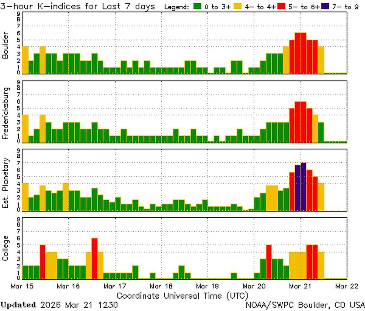 Впрочем, есть вероятность, что магнитная буря 22 марта окажется более продолжительной. Дело в том, что индекс геомагнитной активности Kp будет на предбуревом уровне 4.3 почти всю вторую половину дня.