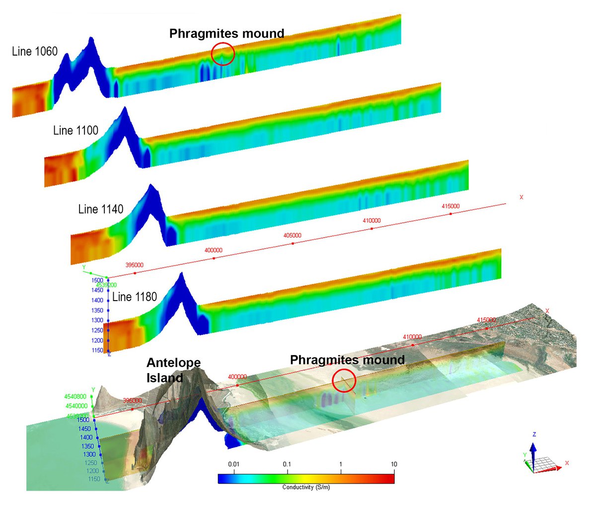 Учёные провели электромагнитную съёмку: вертолёт с оборудованием фиксировал электрическую проводимость пород и особенности их строения. Этот метод позволяет различать солёную и пресную воду, а также оценивать глубину залегания водоносных слоев.