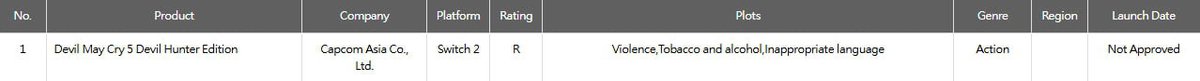 Рейтинговое агентство Тайваня выдало возрастной рейтинг версии Devil May Cry 5 для портативной консоли Nintendo Switch 2. Сама Capcom пока не подтверждала выпуск игры на этой платформе.