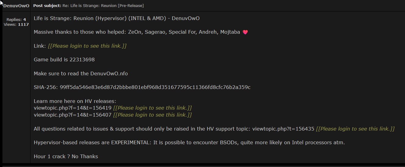 Адвенчура Life is Strange: Reunion, защищенная системой Denuvo, оказалась взломана сразу после выхода. Защиту игры обошли с помощью гипервизора, популярного в последнее время способа взлома Denuvo.