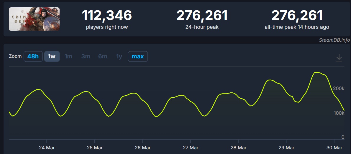 Онлайн в Steam-версии Crimson Desert превысил 276 тысяч человек на вторые выходные релиза. Это лучший показатель в истории игры, на старте Crimson Desert привлекла в Steam около 248 тысяч человек одновременно.