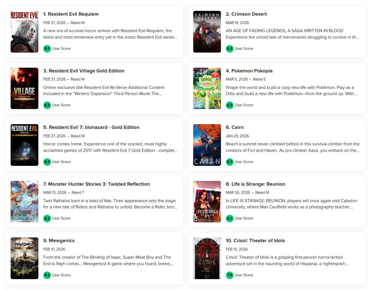 Через пару недель после релиза Crimson Desert уступает по пользовательскому рейтингу только Resident Evil Requiem. Догнать ее вряд ли получится: игроки выдали Resident Evil Requiem 9.4 балла из 10.