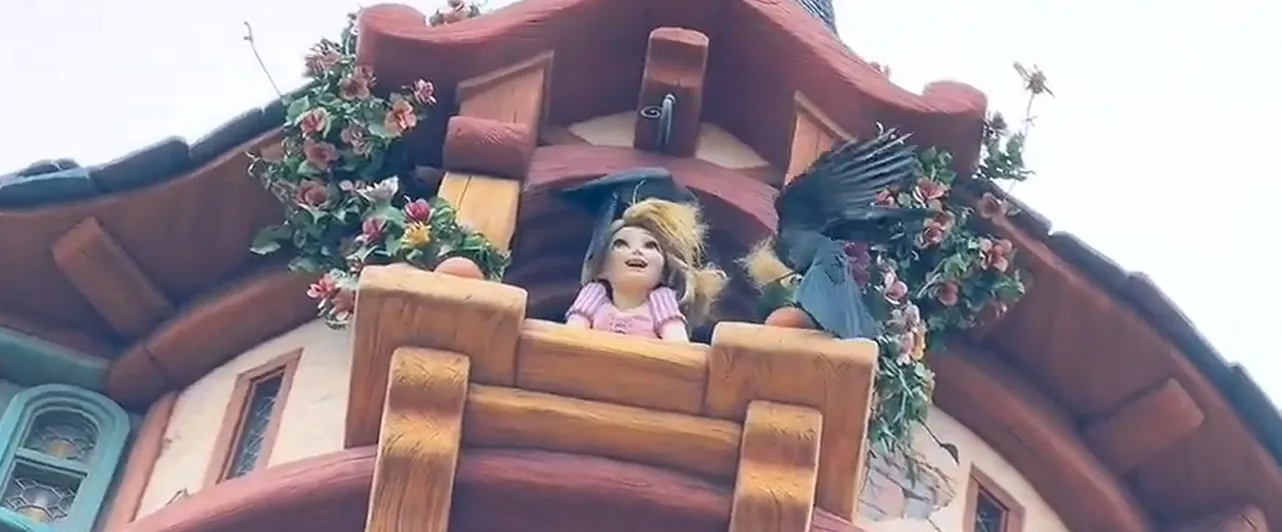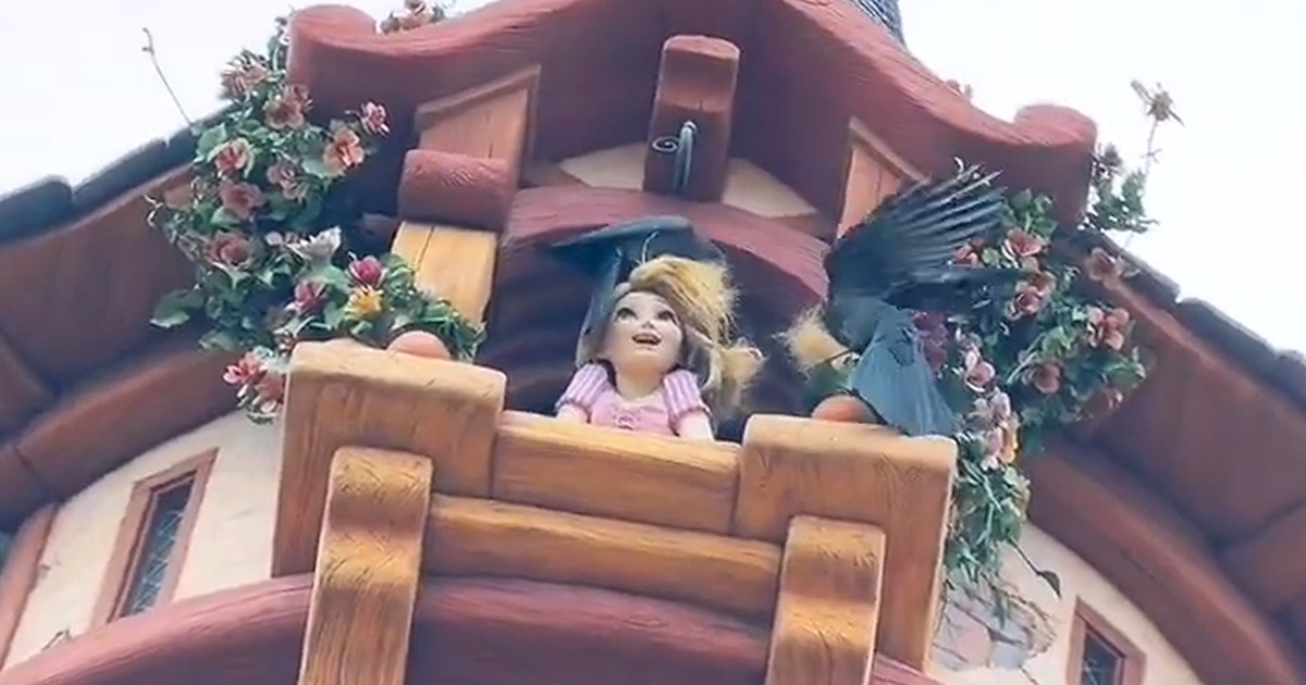 Обычно роботизированная версия Рапунцель сидит в своей башне и поет, но на этот раз в представление вмешались вороны. Они атаковали прическу Рапунцель прямо во время песни, робот, конечно, никак на это не отреагировал и продолжил петь дальше.