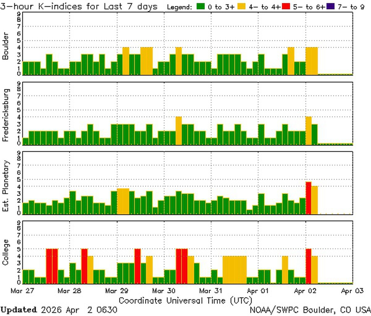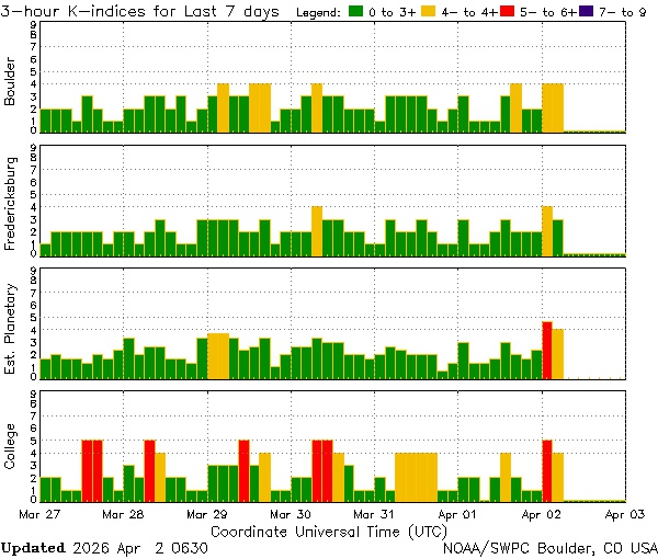 В первые часы 3 апреля также ожидается повышенная активность магнитосферы. Ближе к утру индекс Kp снизится до 3 и будет оставаться на таком уровне на протяжении почти всего дня. Это значит, что мы можем увидеть локальные магнитные бури.