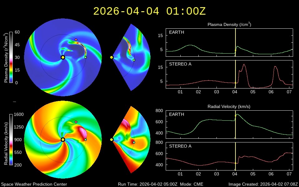 Согласно модели распространения солнечного ветра WSA-Enlil, корональный выброс массы зацепил Землю самым краем. Если аналитики ошиблись и Земля глубже погрузится в поток плазмы, то магнитная буря 4 апреля будет даже сильнее прогнозов.