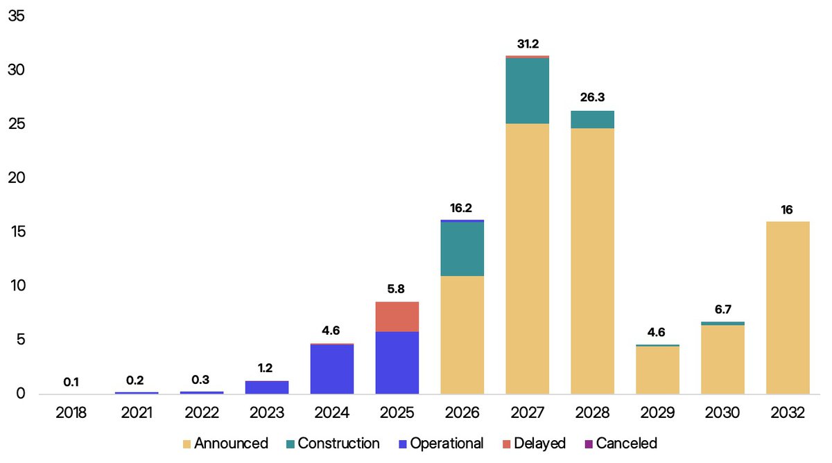 При этом планы на 2027 год выглядят еще более амбициозно: заявлено свыше 25 ГВт новых мощностей, реально начато строительство площадок менее чем на 10 ГВт. По более отдаленным годам строительство практически не ведется, но это нормально — время еще есть.