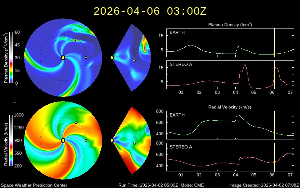 До конца 5 апреля Земля должна выйти из потока солнечных частиц, ответственного за последние геомагнитные возмущения. Ожидается, что магнитных бурь 6 апреля не будет и индекс геомагнитной активности Kp даже не приблизится к предбуревой зоне.