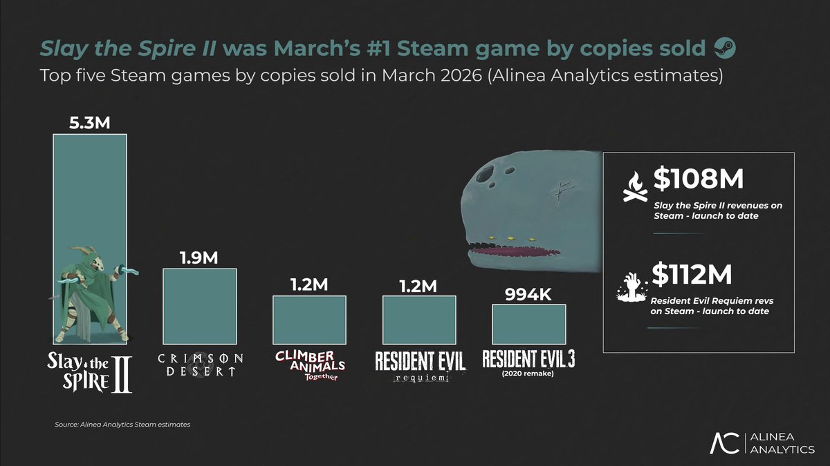 Resident Evil Requiem и Crimson Desert не смогли возглавить топ самых продаваемых игр Steam в марте, подсчитали аналитики Alinea Analytics. По данным компании, первое место досталось Slay the Spire 2.
