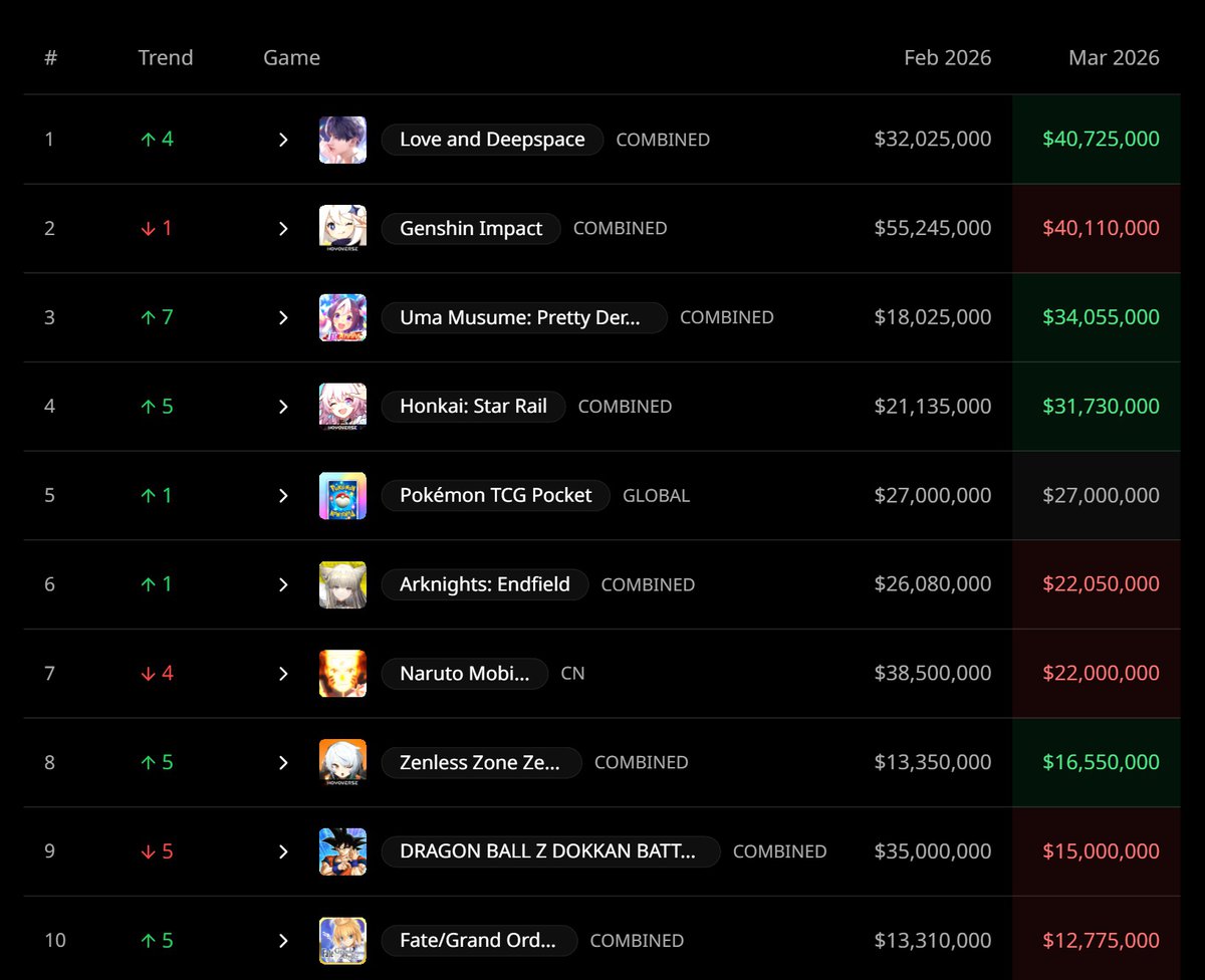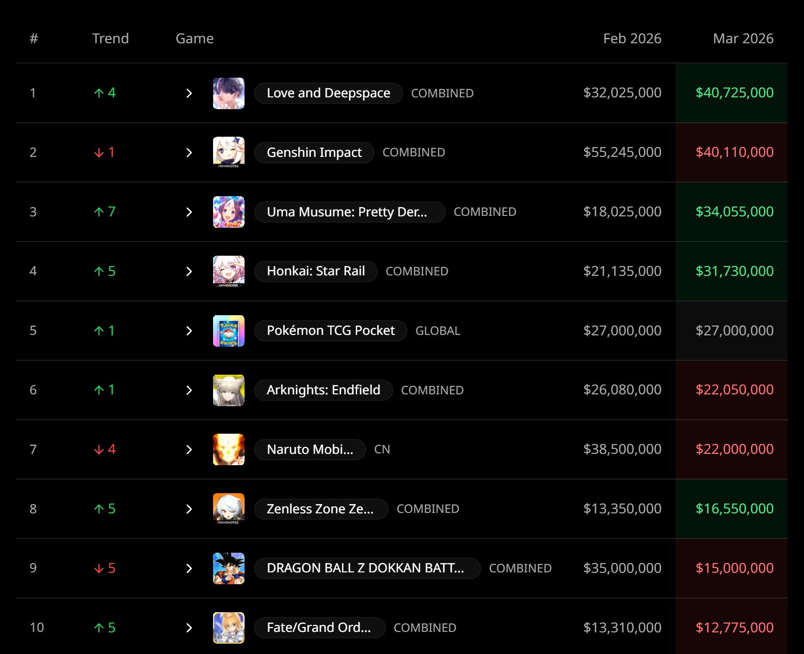 Основным генератором выручки в марте 2026 года стала Genshin Impact, заработавшая $40.1 миллиона ($38.8 миллиона год назад). На втором месте идет Honkai: Star Rail с $31.7 миллиона ($29.9 миллиона год назад).