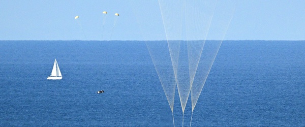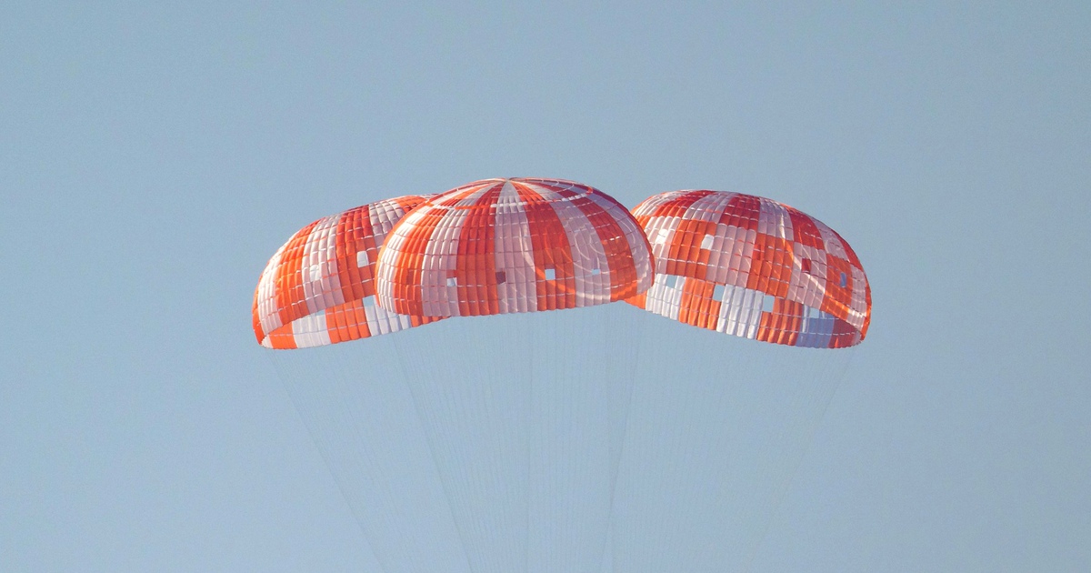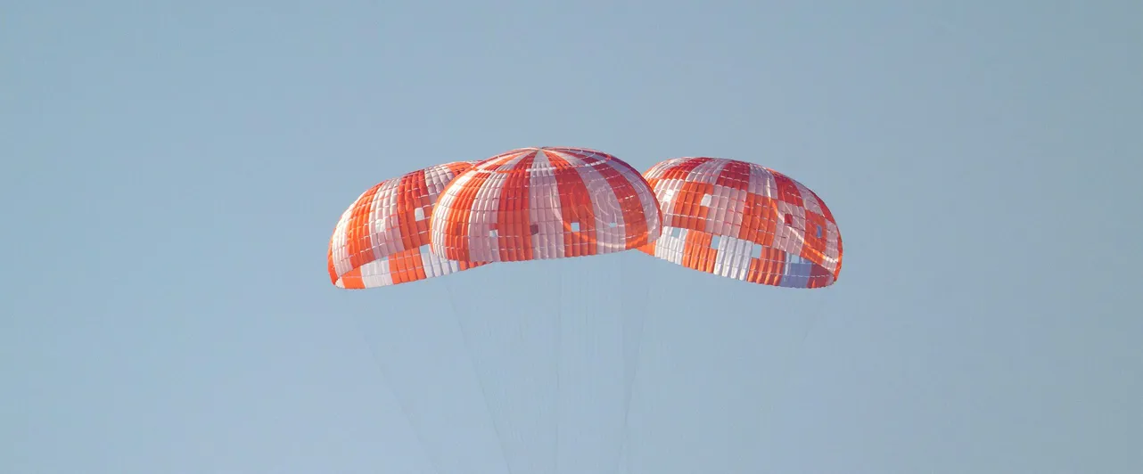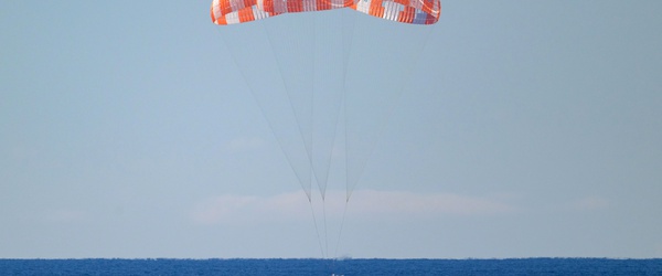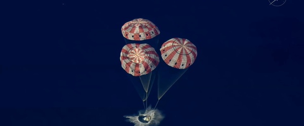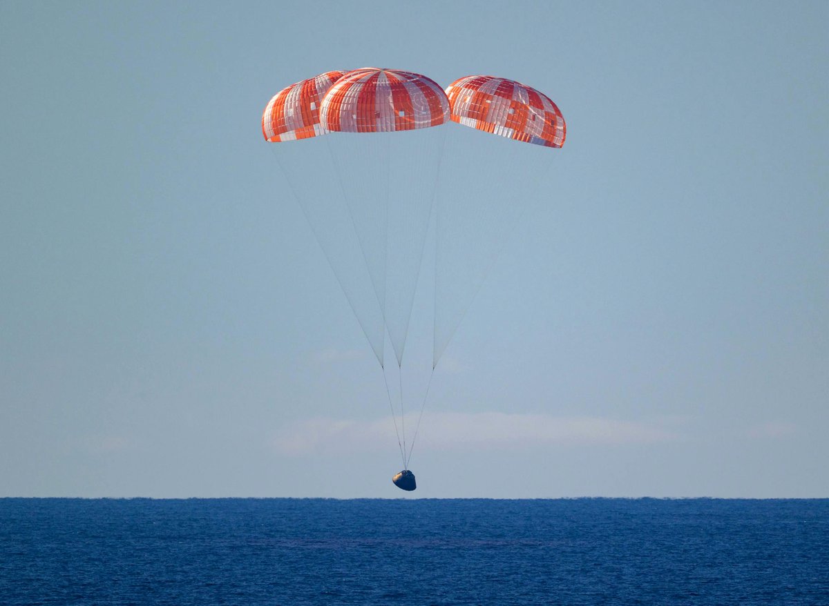 После прохождения через плотные слои атмосферы «Орион» сперва раскрыл стабилизирующие парашюты, а затем основные, мягко приземлившись в океан. Процесс посадки отслеживался ВМС США и NASA, астронавтов сразу же извлекли из корабля и эвакуировали.