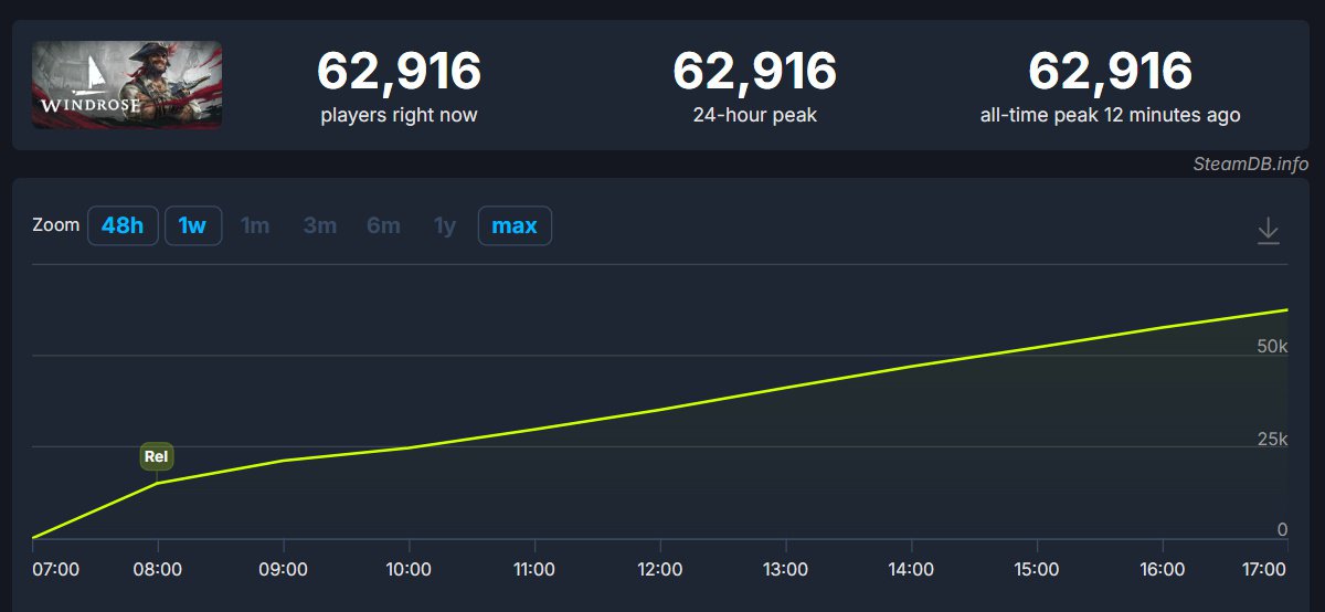 Сейчас у Windrose очень положительные отзывы и постоянно растущий онлайн. На релизе в Windrose одновременно играло порядка 15 тысяч человек, к вечеру этот показатель достиг 62 тысяч и продолжает расти.