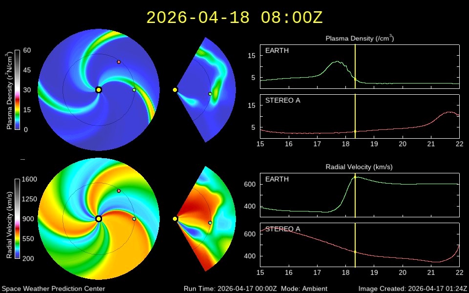 Впрочем, во второй половине для 18 апреля аналитики предсказывают высокий уровень активности магнитосферы. Индекс Kp не опустится ниже 3 (буря начинается при 4.6), возможно, мы увидим локальные геомагнитные бури.