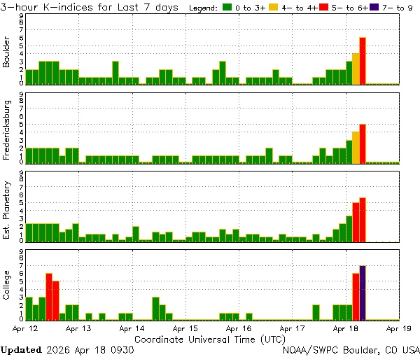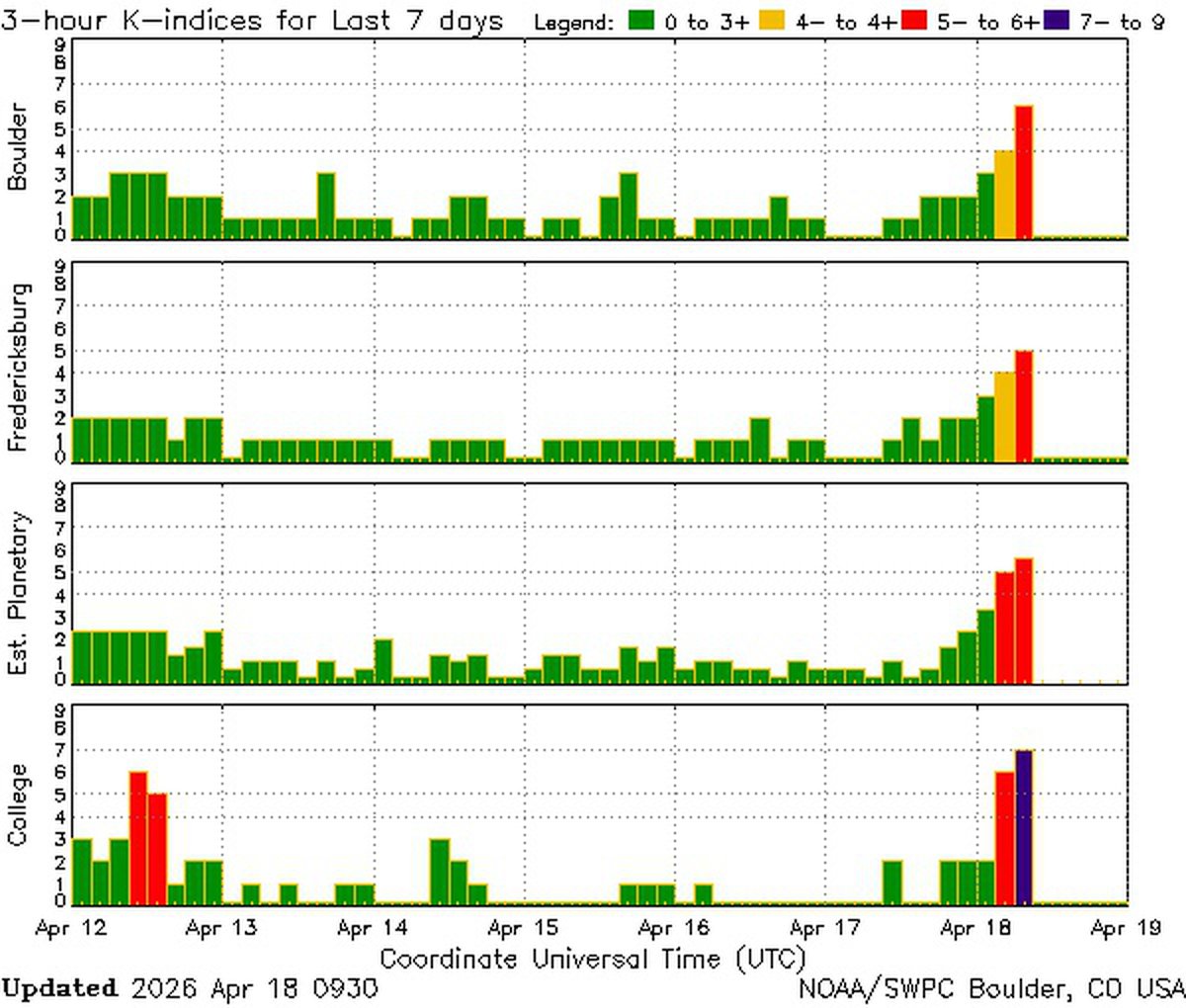 Прогнозы утверждали, что геомагнитная буря 18 апреля начнется в районе полуночи по Москве. В реальности шторм запоздал примерно на половину суток: детекторы NOAA зафиксировали начало шторма незадолго до полудня по Москве.