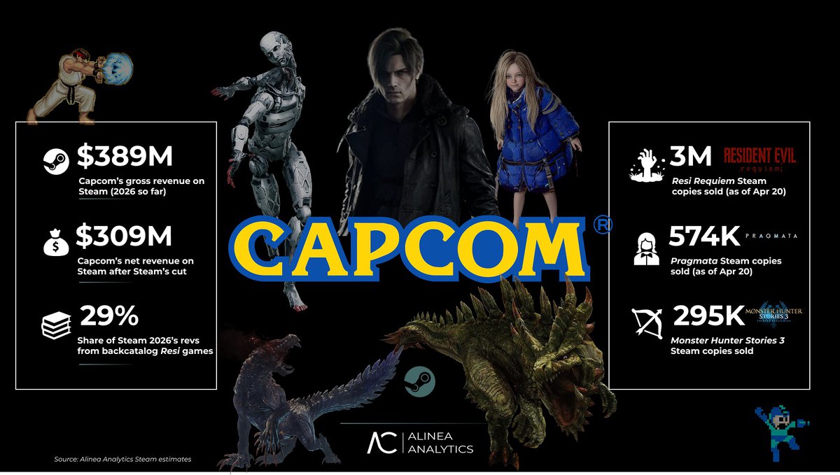В общей сложности, подсчитали аналитики, игры Capcom заработали в Steam за 2026 год порядка $389 миллионов. Основным генератором выручки пока остается Resident Evil Requiem.