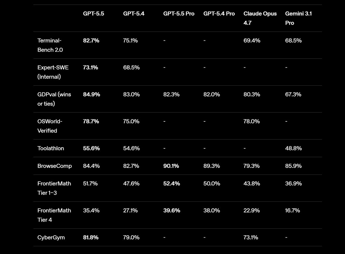 По оценке самой OpenAI, GPT-5.5 превосходит GPT-5.4 во всех ключевых бенчмарках — правда, иногда разница невелика. Кроме того, в использованных бенчмарках новая модель почти всегда лучше Claude Opus 4.7 и Gemini 3.1 Pro.