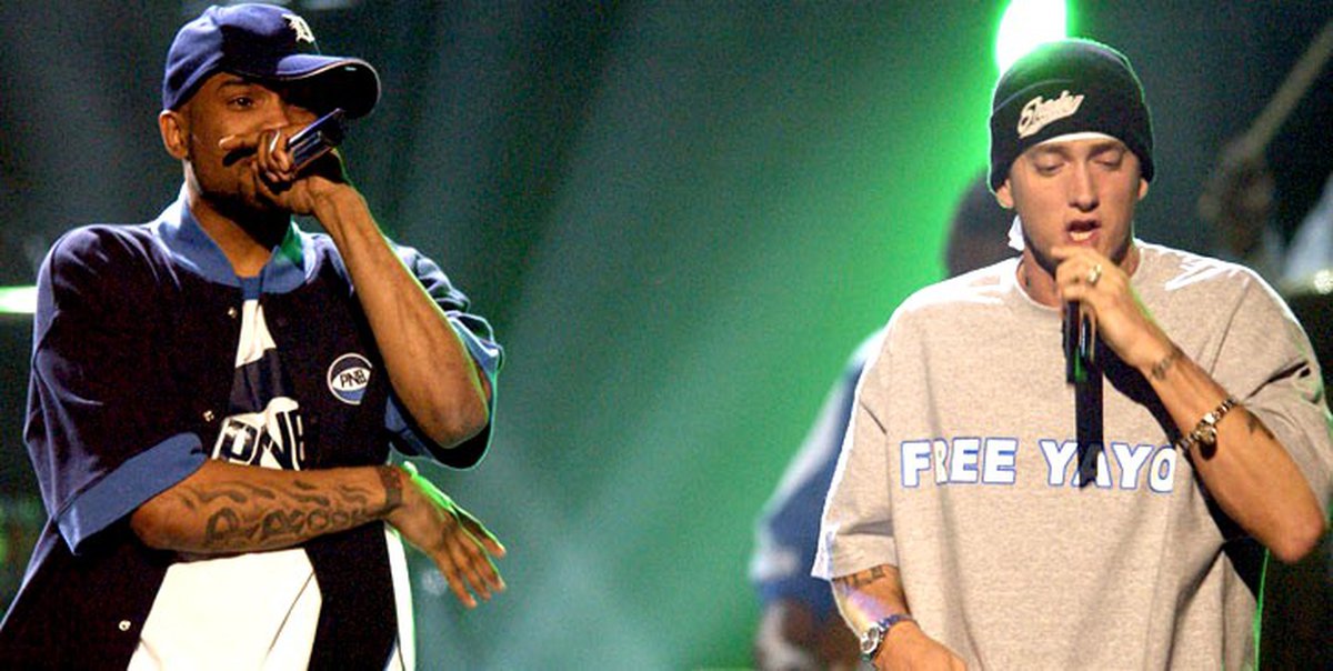 Очень долгое время Маршалл пытался доказать в школьных баттлах, что и люди белого цвета кожи могут замечательно читать рэп. Однажды, ему это удалось и он участвовал в баттле с афроамериканцем ДеШоном Дюпри Холтоном, который в будущем будет известен под псевдонимом Proof, и как лучший друг белого рэпера. Известно, что в том баттле никто не победил. Возможно, это и сблизило двух разных ребят.
