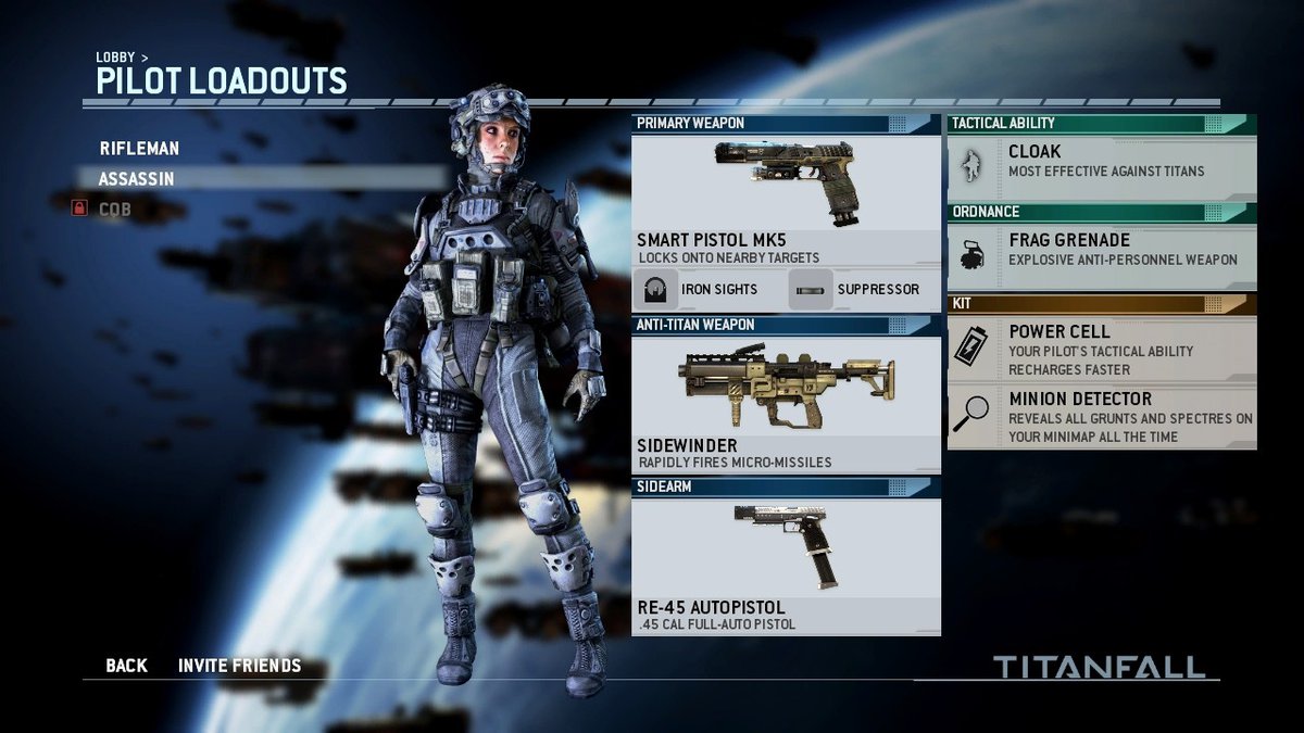 Класс Assassin честно говоря мне по началу представился какой то имбой, которой порой даже было скучно играть. Основное оружие - пистолет Smart Pistol MK5. Он имеет автоматическое наведение на любую цель и отличается крайне высоким уроном. Противник попал в ваше поле зрения, пистолет навелся за 2 секунды, выстрел, противник мертв. Конечно не всегда есть возможность навестись, особенно в тесных пространствах, и благо на втором слоте имеется автоматический пистолет .45 калибра RE-45 Autopistol с безумной скорострельностью. Спустя пару дней теста, люди привыкли к игровой механике и данным классом стало играть уже не настолько просто, как это было в начале. Ведь вся загвоздка пистолета с самонаводкой в том, что в движении он на порядок хуже захватывает цель и уже многие игроки поняли это и начали носиться как угорелые, при виде противника с таким оружием. Против титанов Assassin имеет пулемет Sidewinder, который имеет 25 разрывных патронов и наносит весьма существенный урон титанам, и относительно невысокий - пилотам.