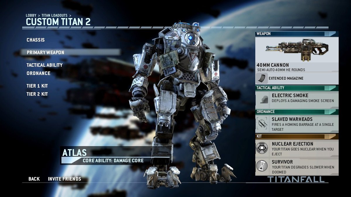 Перки у титанов делятся, как и в случае с перками пилотов, на две категории: Tier 1 и Tier 2. В Tier 1 вы можете выбрать ускоренную регенерацию щитов вашего железного друга, усовершенствованную систему заряжания ракет, которая позволяет сократить время перед новым залпом, и ядерный взрыв. Последний - очень интересный анлок, он позволяет превратить вашего титана в бомбу замедленного действия. После того как ваш титан получит критические повреждения и вы катапультируетесь, произойдет ядерный взрыв, с зоной поражения примерно метров в 30-40. Он способен уничтожить как пилотов, так и титанов, оказавшихся поблизости. В Tier 2 перках выбор уже не такой большой - нам предлагают выбрать из авто-эвакуации при критическом повреждении вашего титана, и замедленного догорания, уже получившей критические повреждения, вашей машины.
