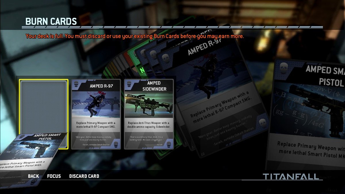 По мимо классовых перков и перков титанов, в игре существуют Burn Cards, которые можно получить выполняя задания. Это такие одноразовые карточки, до трех штук которых, можно активировать в каждом бою. Активируются они во время высадки на поле боя, либо же во время смерти вашего персонажа. Каждая из них действует до первой смерти. В числе этих карточек есть уже знакомые нам, но несколько усиленные стволы (как - не известно, ибо в статистике нигде не значится, предполагаемо - повышенный урон/скорострельность), так же есть и вооружение отсутствующее в бета версии, например болтовая снайперская винтовка с разрывными патронами и пулемет. По мимо оружия в этих карточках имеются различные перки на сканирование локации, возрождение на месте вашей смерти, двойной опыт и многое другое. Так же однажды мне попадалась карточка на еще одного титана, характеристики которого на данный момент описать уже не представляется возможным. Колличество этих карточек лимитировано 26 штуками, так что не стесняйтесь их постоянно тратить. Если инвентарь ваших карточек полон - новые карточки вам перестают выпадать, пока вы не освободите для них место.