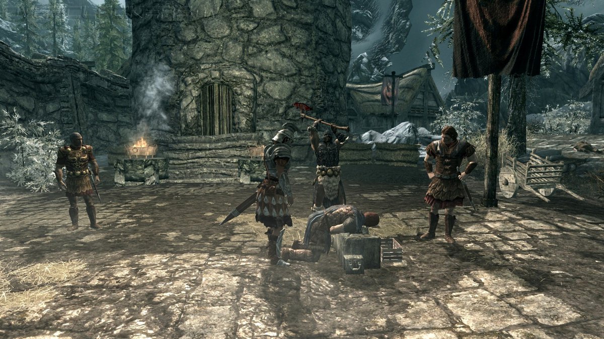 Начинаем мы довольно таки уже привычно в роли пленника, нас везут на казнь за то что нарушали правила границ, и нас приняли за мятежника. На тележке с нами взят в плен Ульфрик Буревестник, как уже потом стало известно он убил короля Скайрима. Когда мы попадаем на место казни, после того как казнят одного из пленных стражник зовёт нас к себе. "А ты кто такой?". И все кто хотя бы немного играл в серию понимают что именно этот момент даёт нам действия на создание персонажа.