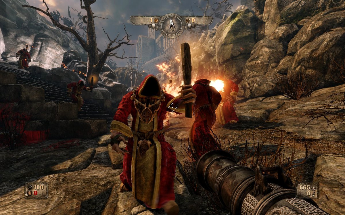 Первым делом нас встречают монахи с факелами и бомбами, модели которых были взяты с ресурсов основной игры, а также с предыдущего дополнения. Они довольно быстрые, могут испускать огонь. Вроде бы неплохо. И нам сразу же дают опробовать новое оружие- Cannon!