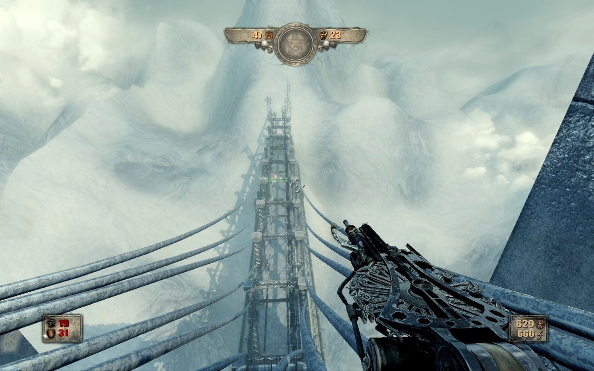 Признаюсь, уровень смоделирован довольно неплохо по графической стилистике. Был даже момент, что смог меня удивить- когда те же монахи начали летать на гробах. Но остальное...Скудный и нудный уровень... А ведь еще и баги! Патроны висят в воздухе!
