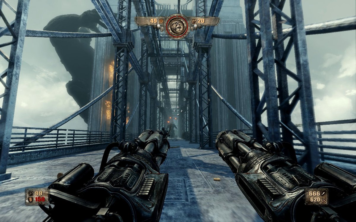 Просто на Вас разом выпускали очередного мини-босса, которого просто так уничтожить не получится! А там дают еще и пулемет! И тогда врагов становится еще больше! Затем одаривают Dual weapons power-up! А в это время по мосту забирается первый основной босс игры- Некрогигант!
