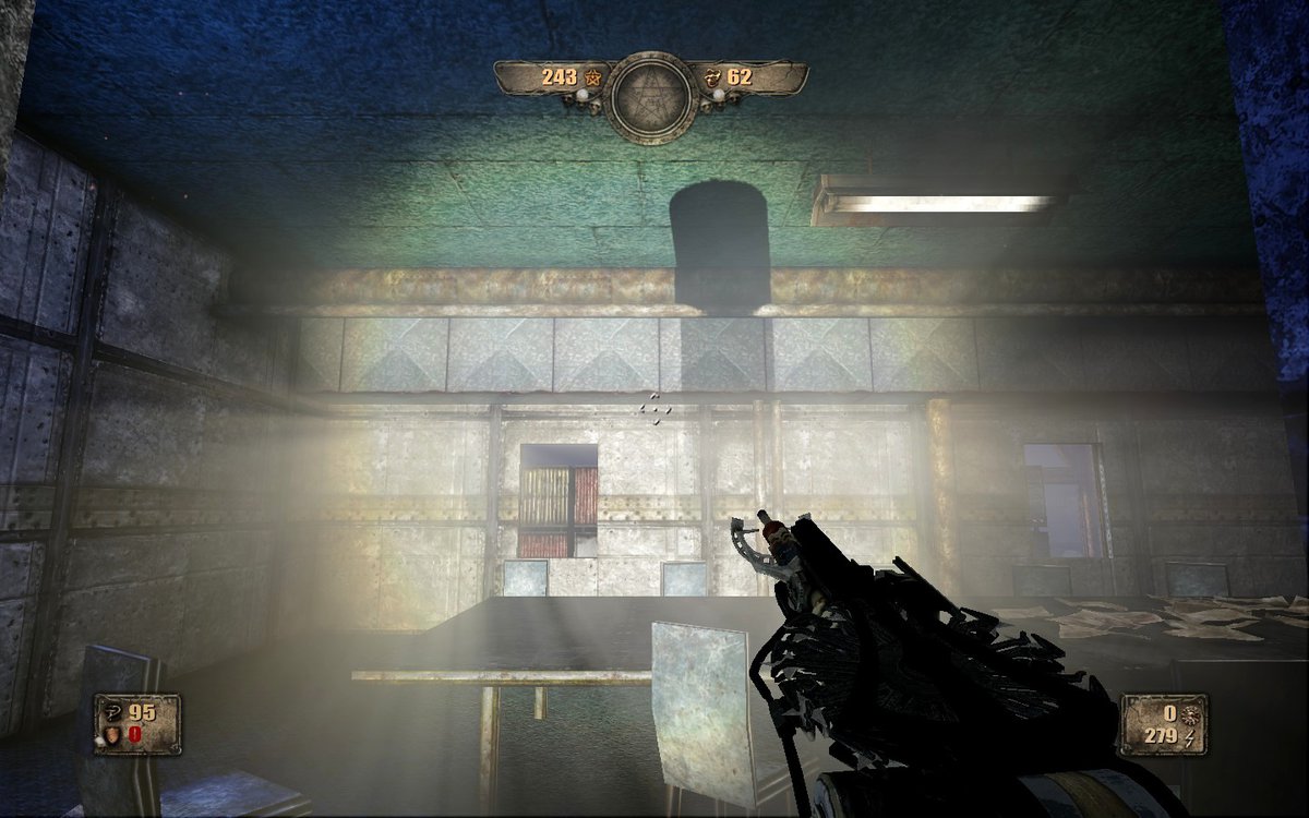 Во-первых, на ней сильно хромает освещение. Непонятным образом ты можешь увидеть тень стоячего врага, что находится за стенкой! Либо неправильно падающее освещение на патроны.