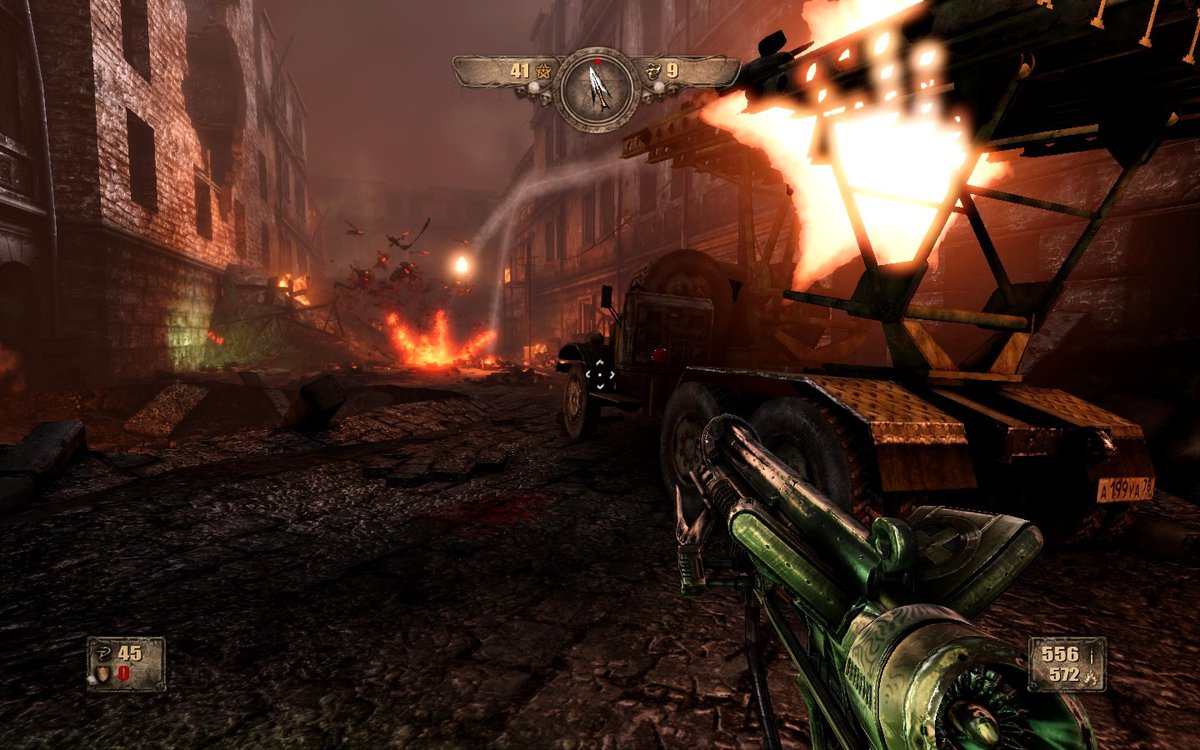 Очень и очень запоминающийся уровень. Представляет из себя, как вы могли заметить из названия, город. Город, охваченный вдоль и поперек огнем. Вокруг будут постоянно оживленно бегать несчастные фашистские солдаты, а танки то и дело будут пытаться Вас взорвать.