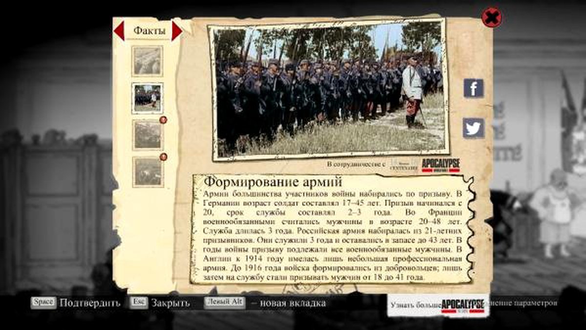 Valiant Hearts игра сама по себе простая, не замысловатая. Проходить ее просто, загадки не сложны хотя в некоторых моментах стоит походить и подумать, куда идти дальше. В каждом новом месте, в котором путешествуют наши персонажи, существует информация о таких же местах, но в реальной жизни и их значение, в нашей истории.