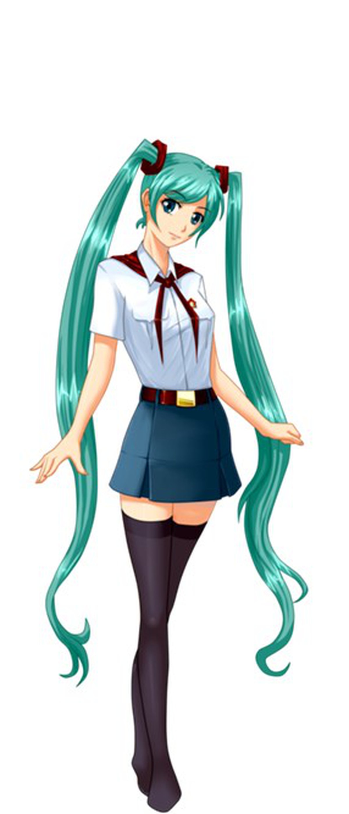 Мику - девушка с бирюзовыми волосами завязанные в два длинных хвоста. Очень болтлива и жизнерадостна.