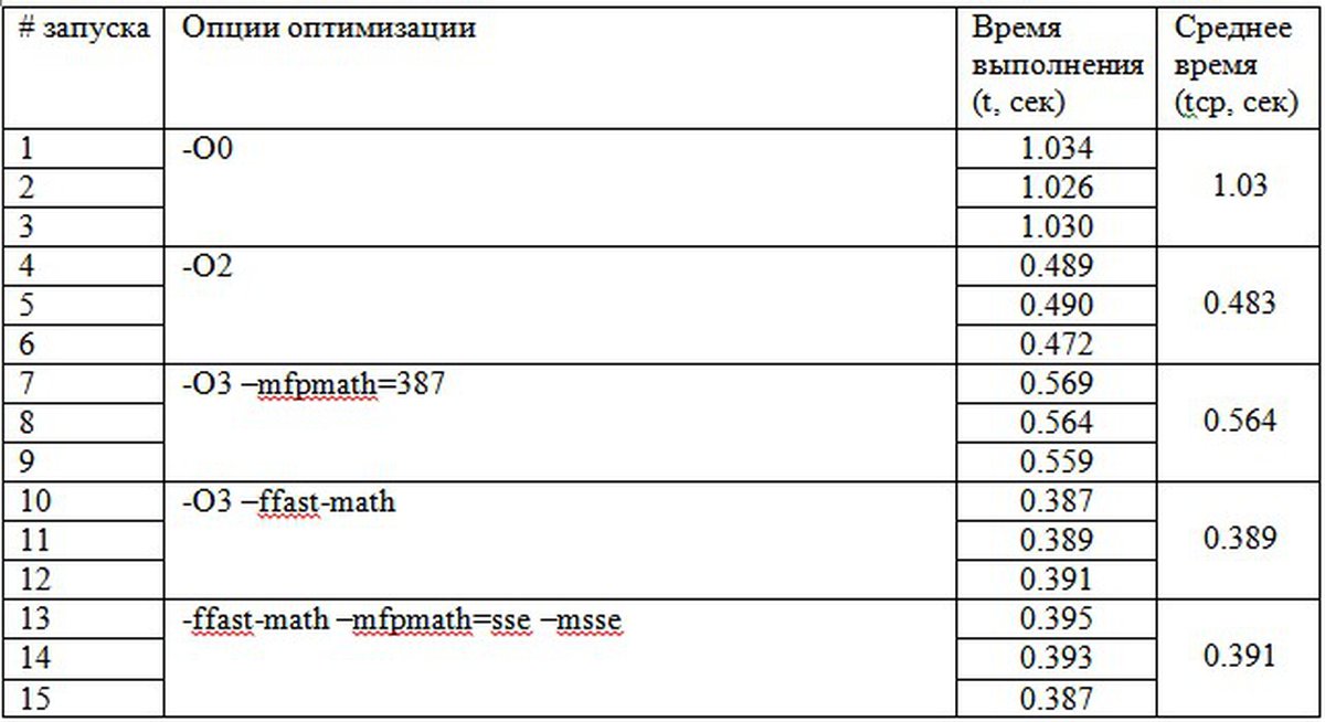 Приобрести практические навыки работы с компилятором GCC командной строки. Исследовать различные опции компилятора для оптимизации программы. Определить их влияние на скорость работы программы и точность вычислений.