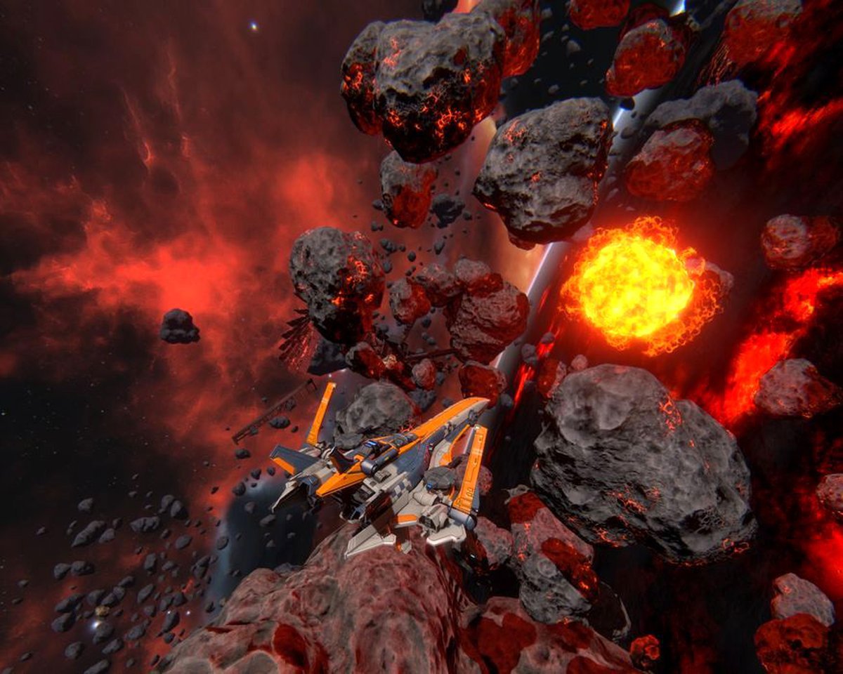 Карт здесь не много, но они огромны и хорошо проработаны. Если слишком близко подлететь к звезде (на картинке оно есть) то прочность начнется уменьшаться. А если спрятаться за астеройд, то враги вас не будут замечать. Однако если вмазаться в тот же астеройд или что-нибудь на подобии, то получишь урон. Не по щитам, а по щам.