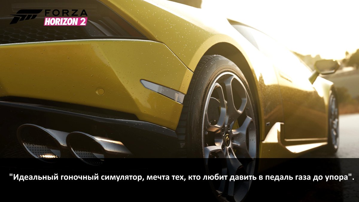 Forza Horizon 2 оставляет невероятные впечатления, как от её внешнего вида, так от самого процесса езды - это лучший автосимулятор в этом году и один из лучших вообще. Потрясающая живая атмосфера, что царит в гонке, дарит невероятные ощущения и вызывает по-настоящему детские эмоции; при виде огромного автопарка аж глаза разбегаются: хочется полюбоваться каждым автомобилем и испробовать его в деле; великолепные и живописные трассы, по которым хочется ездить под отличный саундтрек; отличный вид из салона, вынуждающий любоваться здешними видами именно из него, а не из привычного "со спины", добавьте к этому неплохой тюнинг и мы получаем чуть-ли не идеальный гоночный симулятор.