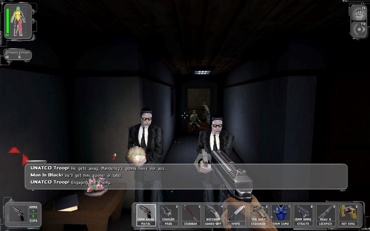 Вообще, вариативность геймплея, все RPG элементы — полная фигня и не имеет никакого отношения к главному, что было в Deus Ex, это атмосфера и сюжет. Ну про сюжет я думаю неоднократно говорили, это одна из лучших историй, рассказанных в интерактивном формате. Deus Ex один из немногих примеров, когда игры могут по щекам надавать разом и литературе, и кино. Быть гораздо более увлекательной и интересной. И в этом данном случае ещё и умными. В Deus Ex очень правильная философия, конечно, это не супер гениальное что-то, это что-то приземлённое, но меж тем игра ставит вопросы, задаёт вопросы. И главное, что не даёт однозначных ответов, т. е. здесь нет однозначно чёрного и белого всегда что-то серое. И собственно все три концовки, которые есть в Deus Ex они это все отражают, потому что здесь нет хорошей концовке в принципе, также и в реальном мире не бывает однозначно хорошего и плохого. Атмосфера всегда была в Deus Ex. Игра цепко затягивала в свой мир, позволяя почувствовать себя реальным участником событий.
