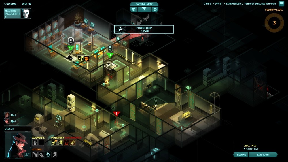 Каждый член вашей команды имеет ограниченное число очков действия, которое может быть использовано для перемещения, взлом устройств, установку ловушек, или на устранение противника с помощью электрошока, чтобы затем обыскать его в поисках различных секретов, оружия и кредитов. Вы должны быть осторожны и тщательно планировать каждый ход. Советую потратить на сбор ресурсов больше времени, но сильно не увлекайтесь, ибо после совершения определённого числа ходом, увеличивается уровень безопасности противника, что может привести к весьма неблагоприятным последствиям — провалу операции.
