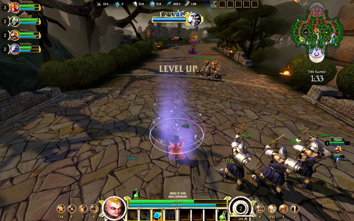 Игра явно вдохновлялась не Дотой, а ЛоЛом. Это чувствуется. Нету характеристик, есть AP(ablity power), есть AD(atack power), есть recall. Но знаете, у игры потихоньку появляется свою лицо. Возможно некоторые вещи она взяла из других игр, но все же: почти у каждого предмета есть три уровня прокачки, чтобы улучшить предмет надо заплатить(Rise Of Immortals), есть два дополнительных заклинания, прямо как в Лиге...нет. Если в Лиге вы должны их выбрать до боя, то тут покупаете (!) их в магазине и по своему решению. А еще здесь отдельные слоты для зелий. Они не занимают место в вашем рюкзаке. И да, зелья не сбиваются уроном.