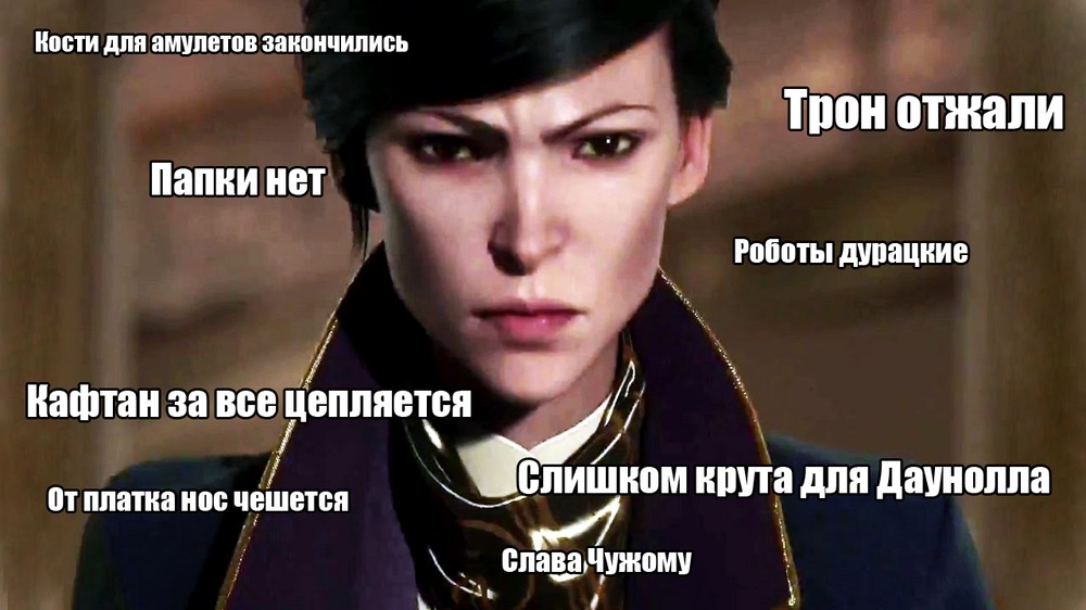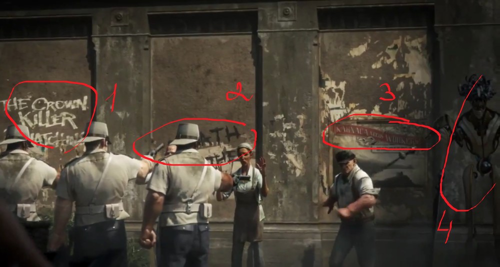 В итоге: из трейлера мы узнаем, что в качестве лишенной чести/опозоренной выступает Эмили. Она лишена трона, возможно по подозрению в убийстве (см. граффити 1). Я даже осмелюсь предположить, что на нее повесили смерть родного отца и Лорда-регента по совместительству - Корво. В своих последних словах герцог сбивчиво говорит "ты будешь как убийца, какой мы тебя и считали, ты будешь как мы" - тут и заговор, и подстава, и снова государственные чистки. Печально плавающая в воде маска Корво намекает не то на кораблекрушение, не то на другие неприятные вещи, связанные с водой. Чужому, как всегда, подавай зрелищ без хлеба. Perfect.