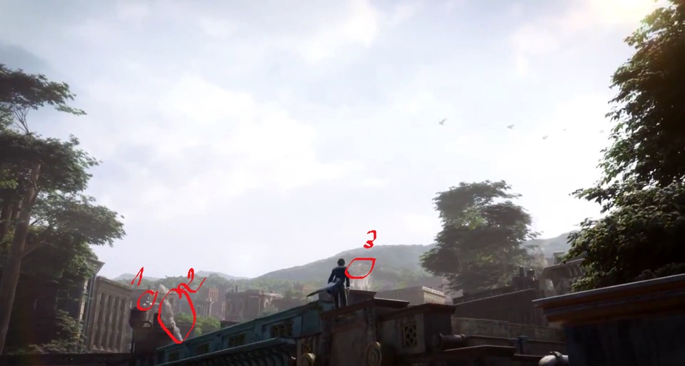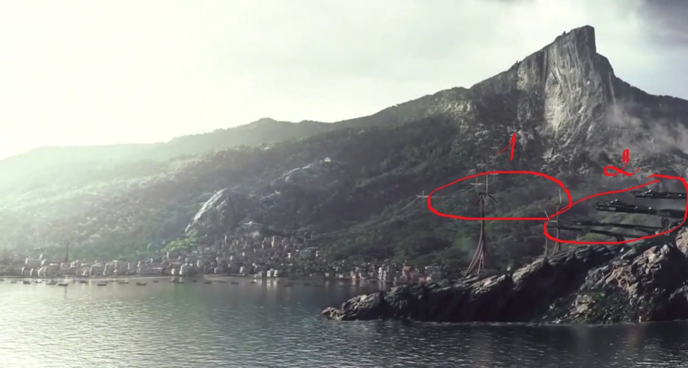 Заокеанский gameranx уже разбирал на составляющие этот трейлер, но мы, Николай Второй, нашлись, что дополнить. Идем по порядку. Перед нами родина Корво - Карнака спустя 15 лет после окончания первой части. Город издалека выглядит отлично - большой, аккуратный, вода безмятежная, а флора буйно зеленеет. По лору Карнака это такой рай для ученых и любителей курортов. Тут замечены недурственные альтернативные источники энергии в виде ветряных генераторов, это вам не китовый жир в бочки заливать. А это внушительная линия ЛЭП? Фуникулер? Пресловутый Коридор ветра? В любом случае, куда тянется эта конструкция и зачем? Но что это под цифрой 2? gameranx считает, что это пушки, и направлены они в сторону некоего внешнего противника. Оружие явно дальнобойное и создано либо чтобы топить суда, либо пламенно здороваться с Дауноллом. Но это не точно :)