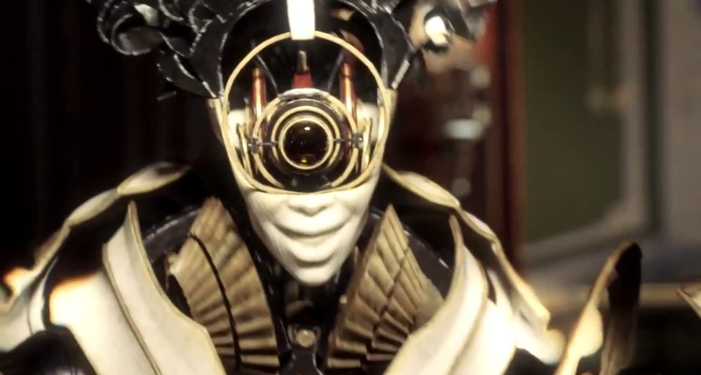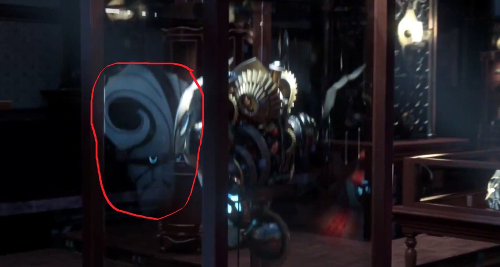Сцена с трансформируищимся залом нужна для демонстрации полета технологии и некой коллекции в частности. Подозреваю, что это прототипы роботов-ассасинов. Конкретно эта модель мне любопытна тем, что напоминает туземную маску. Да-да, повеяло Пандуссией.