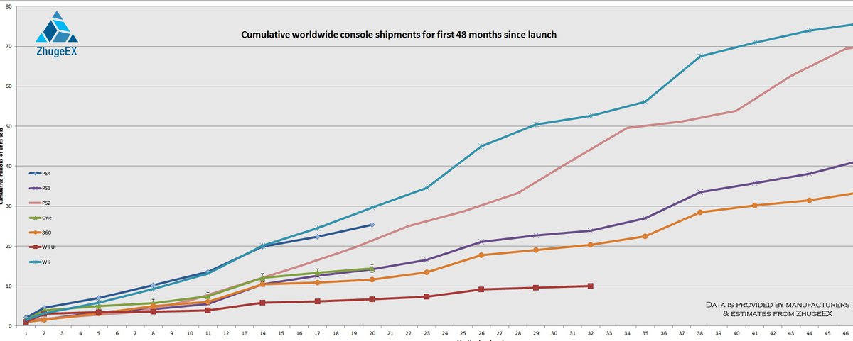На графике выше можно увидеть консолидированные продажи консолей за 4 года с момента запуска; пока продажи PlayStation 4 уступают только Nintendo Wii.