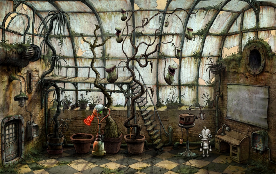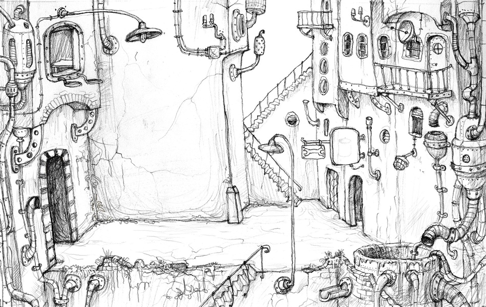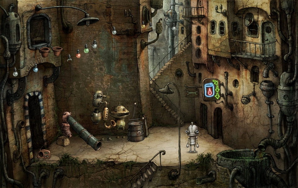 Когда я разрабатывал мир Машинариума, я также создавал его историю — для себя, чтобы понять этот мир лучше и иметь возможность продумать его в деталях. В самой игре этой истории нет, но я расскажу вам — кратенько. Все случилось на одной далекой и забытой планете, куда люди привыкли отправлять мусор, который они производили — старые машины, механизмы, компьютеры и прочее. Из этого механического лома образовались несколько простых роботов. Некоторое время спустя они построили других, более усовершенствованных роботов, а потом — поселение. Так и был создан город Машинариум.