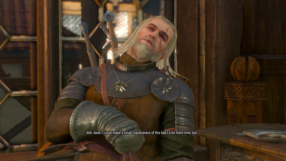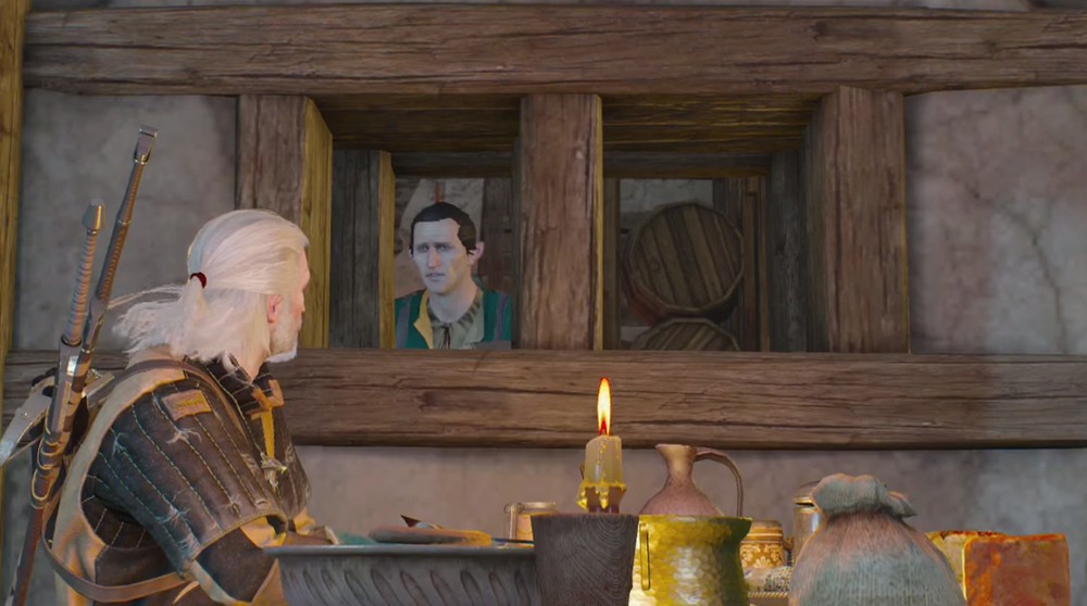 Геральт: А, ясненько. (лезет в сундук, забирает монеты, лезет в шкаф, забирает сыр и хлеб) Ну, рад был повидаться!